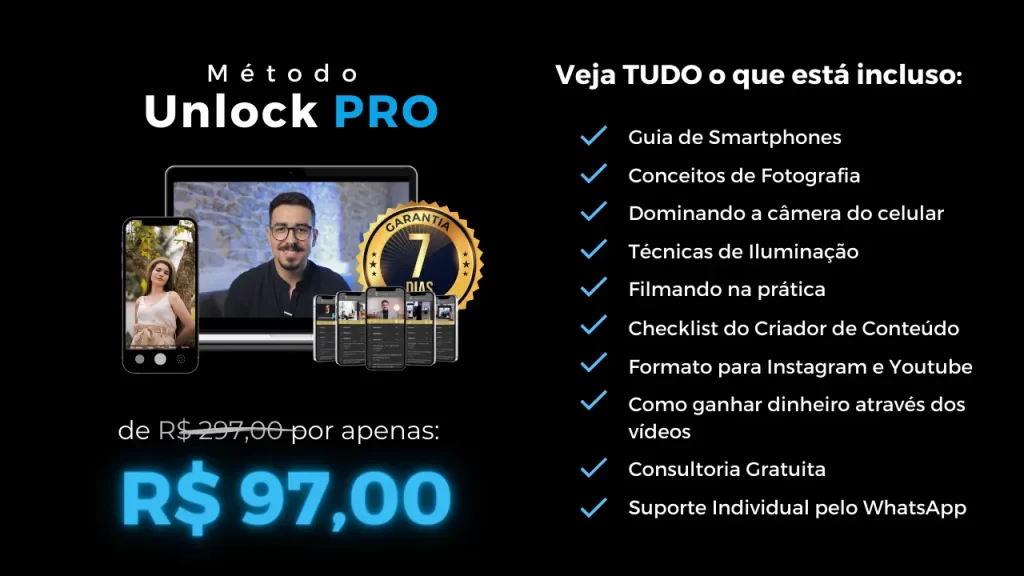 O método Unlock PRO foi feito para que qualquer um possa facilmente aumentar a qualidade dos seus vídeos em pelo menos 10x. Mesmo que você não tenha nenhuma experiência com vídeos. Eu vou te mostrar o meu passo a passo pessoal, como se você estivesse aqui do meu lado, fazendo junto comigo!